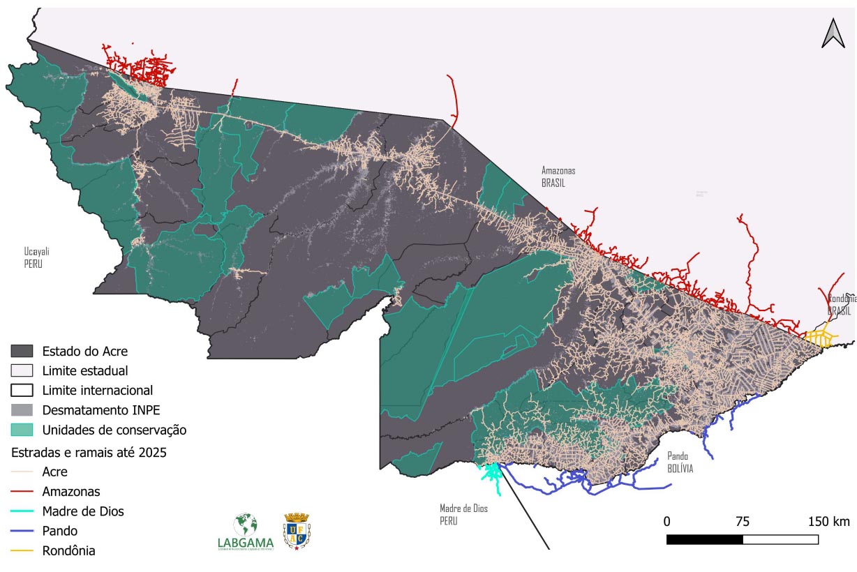 Por fim, as conexões regionais ampliam a escala do problema. A identificação de dezenas de pontos de ligação com estados vizinhos e países como Bolívia e Peru revela que os ramais não são estruturas isoladas, mas parte de uma rede transfronteiriça que pode facilitar tanto a circulação de mercadorias quanto a expansão de atividades ilegais. Nesse contexto, a estrada deixa de ser apenas um traço no mapa e se torna um dispositivo estratégico na reconfiguração da Amazônia contemporânea.