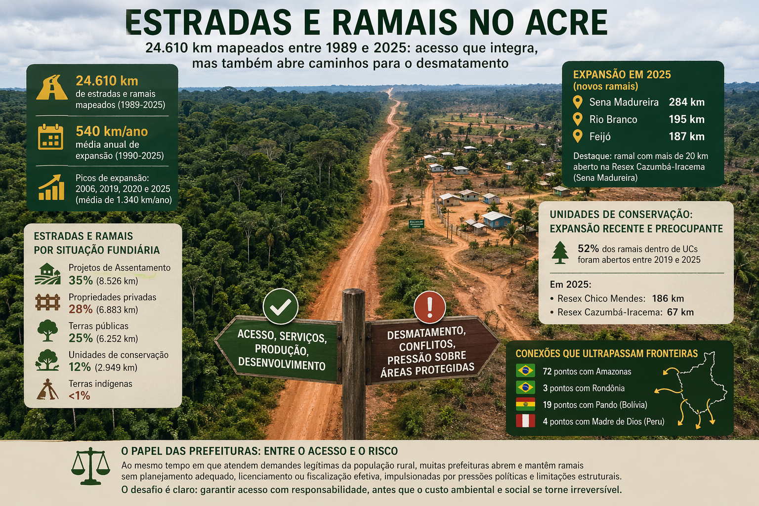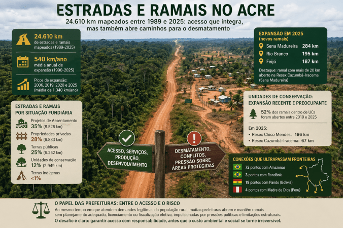 Nos municípios, o avanço também segue padrões definidos. Rio Branco, Sena Madureira e Feijó concentram boa parte da expansão recente, com centenas de quilômetros de novos ramais abertos apenas em 2025. Esses movimentos indicam não apenas crescimento local, mas a reorganização de fluxos econômicos e populacionais que reposicionam o estado dentro da lógica da fronteira amazônica. Em Sena Madureira, por exemplo, a abertura de um ramal de mais de 20 quilômetros dentro de uma unidade de conservação evidencia a fragilidade dos mecanismos de fiscalização.