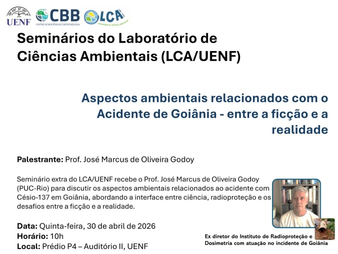 Um seminário realizado pelo Laboratório de Ciências Ambientais (LCA) da Uenf discutirá  os aspectos ambientais relacionados ao acidente com Césio-137 em Goiânia em 1987. O palestrante será o Professor Doutor José Marcus de Oliveira Godoy do Departamento de Química da PUC-Rio que deverá  abordar a interface entre ciência, radioproteção e os desafios entre a ficção e a realidade.