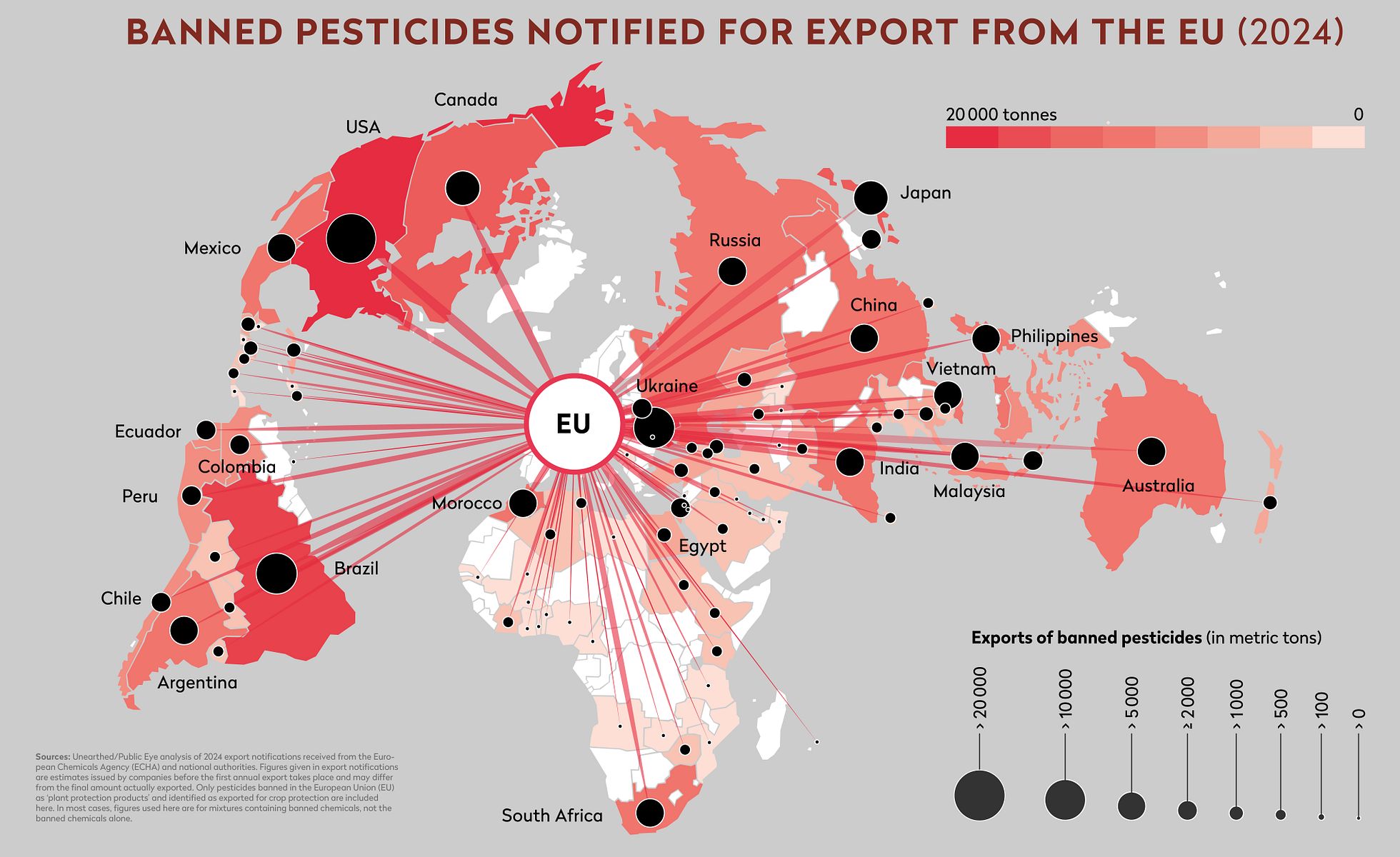 O jornal The Guardian já havia noticiado os efeitos perigosos dos agrotóxicos exportados pela UE em países como o Brasil , onde foram pulverizados em fazendas de cana-de-açúcar que abasteciam a Nestlé e um importante fornecedor brasileiro de açúcar para a Europa, e a Costa Rica , onde as pessoas reclamaram de odores “insuportáveis” que acompanhavam uma série de problemas de saúde quando aviões pulverizavam pesticidas sobre plantações de banana e abacaxi do país. O Reino Unido também exportou agrotóxicos para o Brasil que considera impróprios para fazendas britânicas.