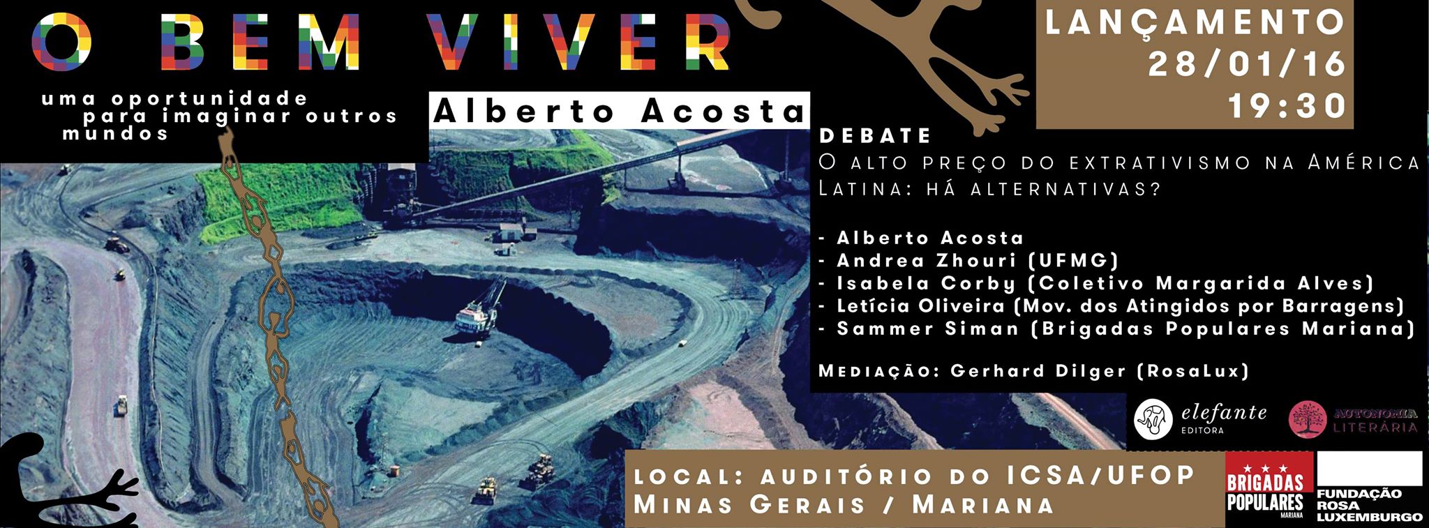 Lançamento-debate do livro “O Bem Viver – Uma oportunidade para imaginar outros mundos”, escrito pelo político e economista equatoriano Alberto Acosta, em Minas Gerais, palco da maior tragédia extrativista dos últimos tempos. O livro, um dos maiores clássicos da literatura política contemporânea na América Latina, é fruto da parceria entre as editoras Editora Autonomia Literária e Editora Elefante. A publicação se viabilizou graças ao apoio da Fundação Rosa Luxemburgo e este evento graças aos aguerridos companheiros das Brigadas Populares!