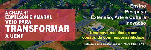 Chapa 11 prometendo que “veio para transformar a UENF”, tendo no fundo uma produção visual com o campus Leonel Brizola que transmite um sentido futurístico.