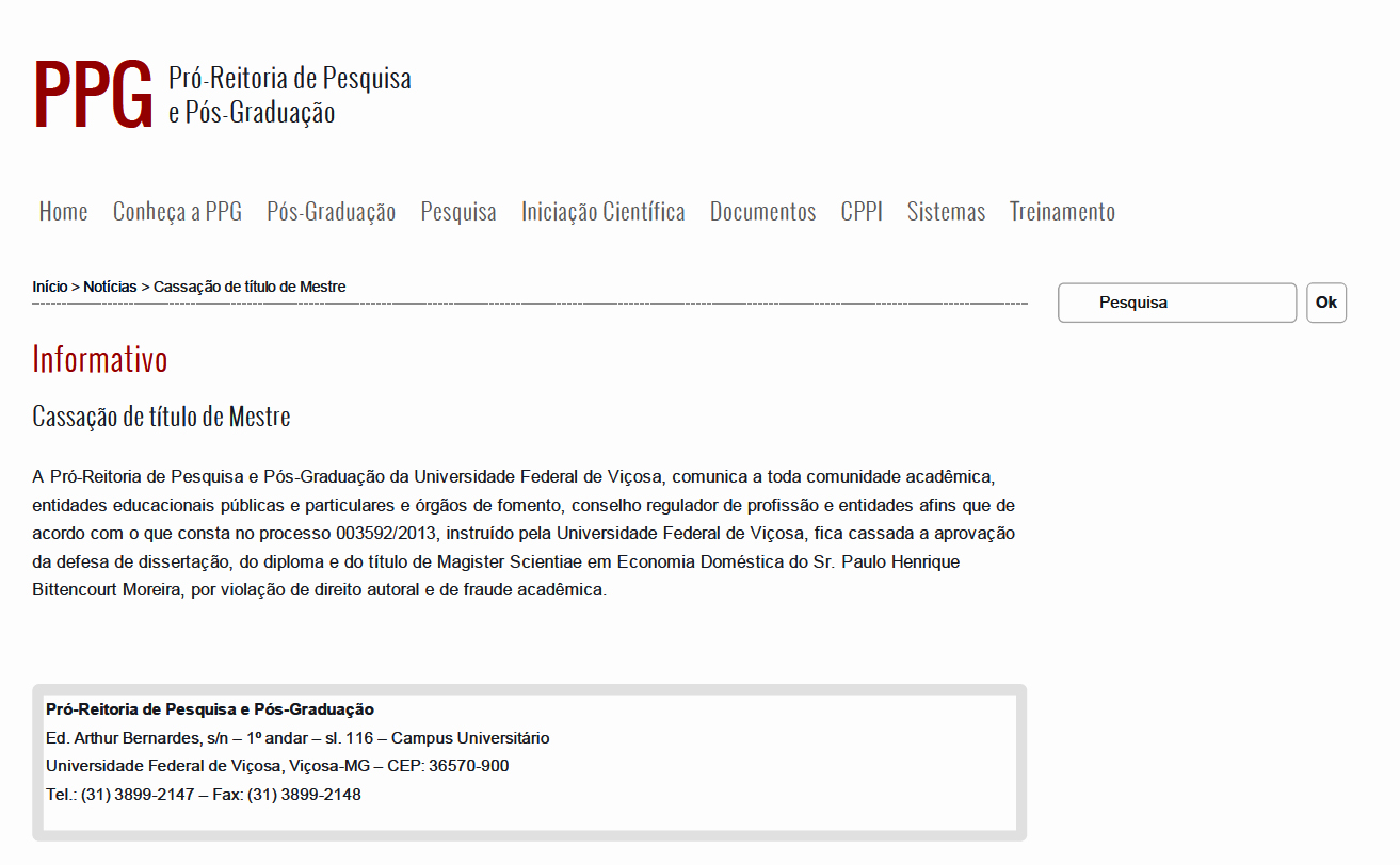 Em 07 de junho deste ano publiquei aqui o caso da cassação de um título de mestre na Universidade Federal de Viçosa que teve uma ampla repercussão (Aqui!). Naquela postagem notei que poderíamos estar apenas diante da ponta de um grande iceberg. Não é que hoje (27/10), a Universidade Federal de Minas Gerais comunicou a decisão do seu Conselho Universitário de cassar de um título de doutor em Estudos Literários (ver nota abaixo) também pela prática de plágio!