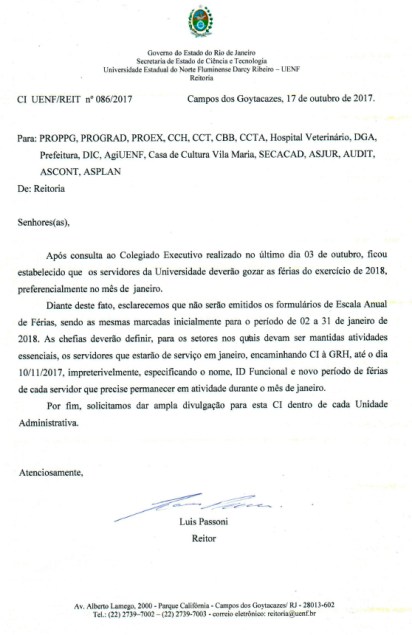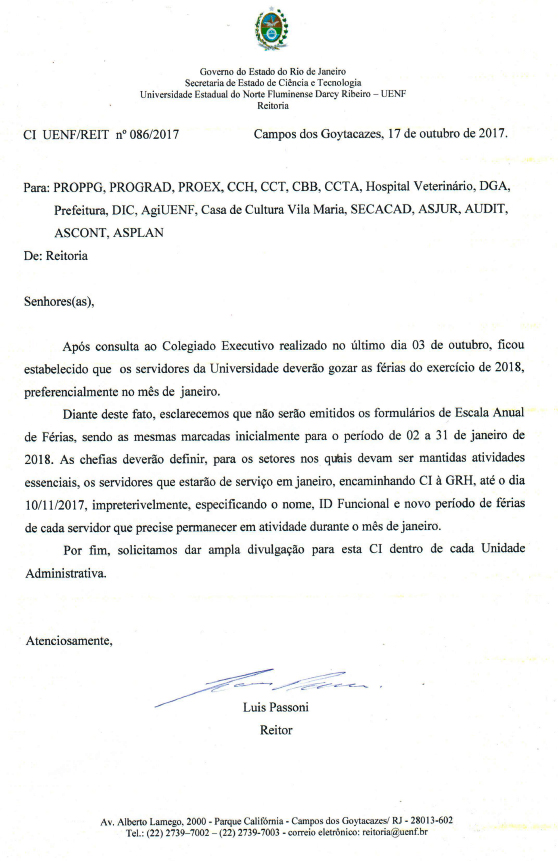 Sobre os esclarecimentos da ADUENF em relação às férias coletivas, segue em abaixo a CI 086/2017. Lê-se neste documento que “ficou estabelecido que os servidores da Universidade deverão gozar as férias de 2018 PREFERENCIALMENTE em janeiro”. Ainda no mesmo documento lemos que “não serão emitidos os formulários de Escala Anual de Férias sendo as mesmas marcadas inicialmente para o período de 02 a 31 de janeiro”.