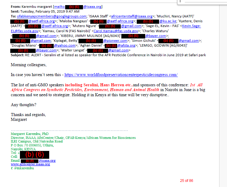 Margaret Karembu, uma influente formuladora de políticas quenianas e membro inicial do Bonus Eventus, enviou um alerta por e-mail a um grupo que incluía funcionários do setor agroquímico e autoridades do USDA, muitos dos quais também eram membros do Bonus Eventus.