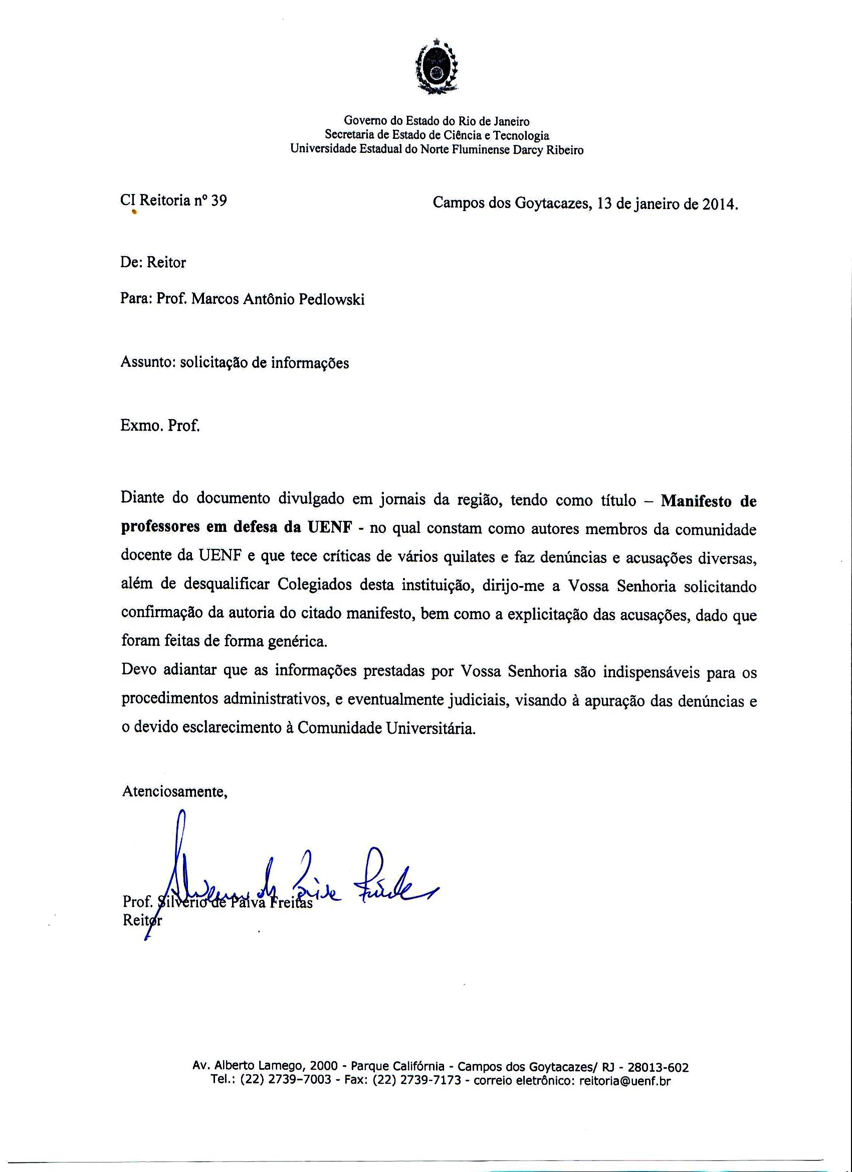 Pessoalmente considero grave que a reitoria da Uenf tenha tornado essa situação pública, na prática emitindo um pré-julgamento sobre o mérito de uma denúncia que deveria ter sido tratada de forma muito cuidadosa, principalmente por causa da existência de uma possível vítima de assédio sexual, sem ter em mãos uma rigorosa apuraração dos fatos. Esse caso deveria ter ficado reservado aos limites do Conselho Universitário, onde o caso foi apresentado pela reitora Rosana Rodrigues, e não tornado público sem que qualquer apuração tenha sido aparentemente iniciada.