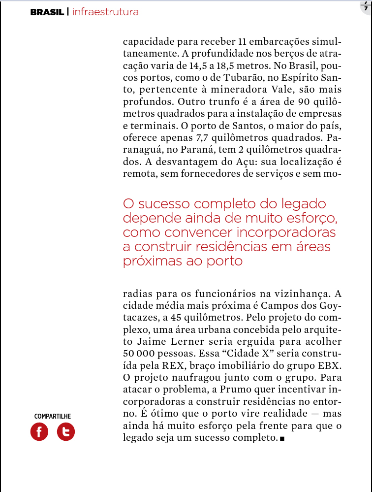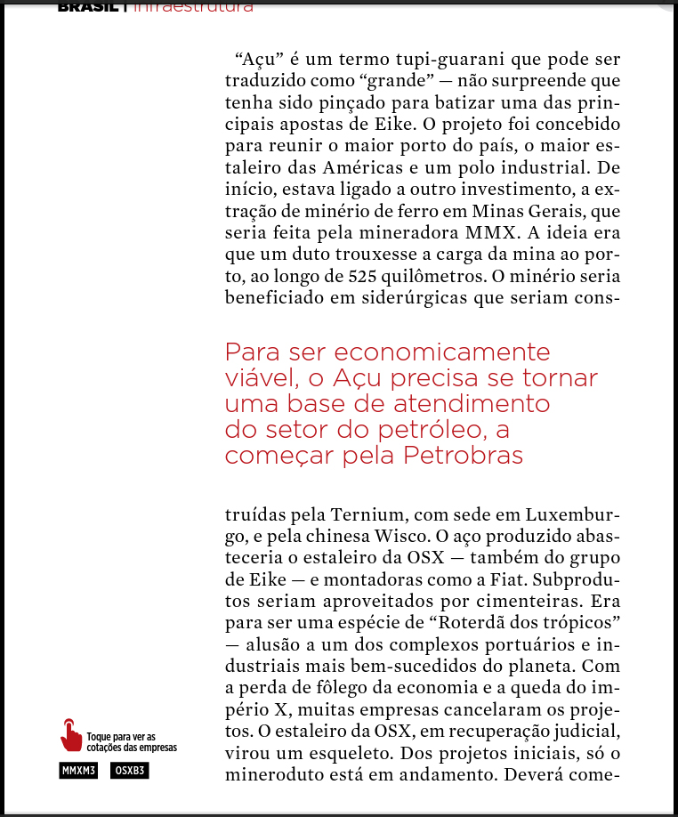 Em 30 de outubro, a OGX entrou com pedido de recuperação judicial, apenas cinco anos depois de fazer o maior IPO do país. Caso seja aceito pelos juízes que avaliarão o caso, a OGX protagonizará também a recuperação judicial mais complexa da história do país. Até o fechamento desta edição (em 5 de novembro), a Justiça não havia julgado o pedido.