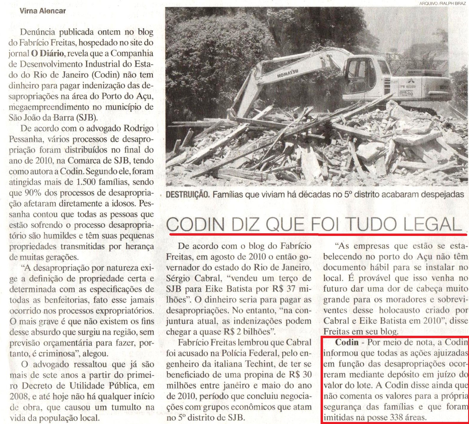 O jornal O DIÁRIO publicou hoje (25/08) uma interessante matéria assinada pela jornalista Virna Aguiar onde elementos contundentes são apresentados pelo advogado sanjoanense Rodrigo Pessanha sobre as escabrosas desapropriações realizadas pela Companhia de Desenvolvimento Industrial do Rio de Janeiro (Codin), inicialmente em benefício do conglomerado do ex-bilionário Eike Batista e atualmente do fundo privado estadunidense EIG Global Partners (ver material abaixo).