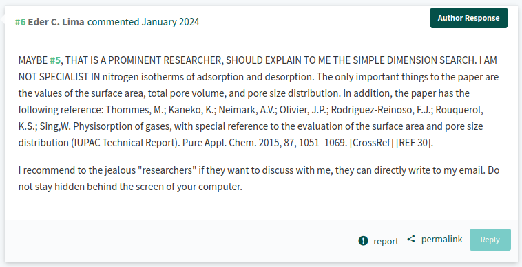 “ 1 e #2 estão tentando denegrir outros pesquisadores, talvez por serem pesquisadores fracos e espalhados na Comunidade Científica. […] . Recomendo fortemente que #1 e #2 retornem às suas aulas de graduação e estudem mais Física e Análise Instrumental, pois foram aprovados sem aprender o mínimo de conceitos para fazer uma pesquisa.”