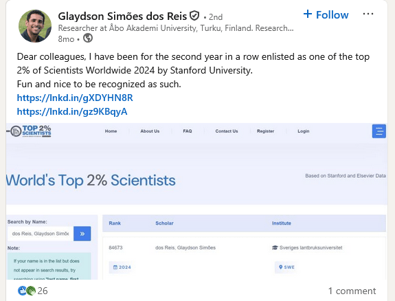 O brasileiro ativo participante da indústria de artigos científicos Eder Lima conseguiu instalar seu pupilo Glaydson Simões Dos Reis primeiro na Universidade Sueca de Ciências Agrícolas (SLU) em Umea, e depois na Universidade Åbo Akademi em Turku, Finlândia.