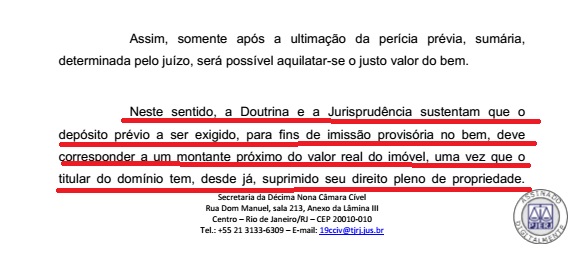 A decisão fala ainda do fato de que o “depósito prévio” no momento da imissão de posse “deve corresponder a um montante próximo do valor real do imóvel” (imagem abaixo), o que sabemos raramente foi o caso nas avaliações feitas pelos peritos contratos pela Codin.