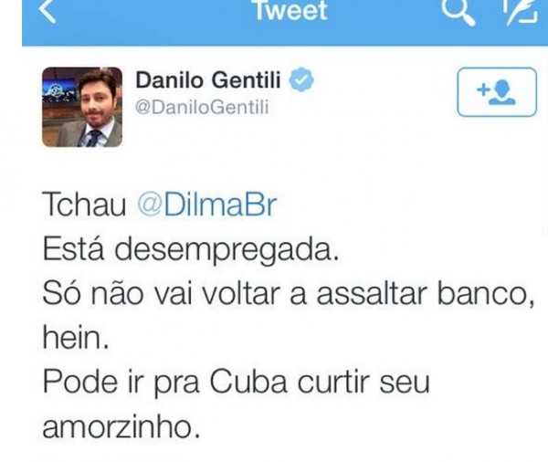 Entre outras delicadezas, a turma implorou pela “intervenção militar”, mandou “Dilma para a Cuba que a pariu”, ameaçou petistas que encontrou pelo caminho. Nem o CQC, a Rede Globo, a Folha de S.Paulo ouEstadão escaparam. E, sempre muito bem educadinha, a malta carregou faixa com os dizeres: “Pé na bunda dela. O Brasil não é a Venezuela.” Ela, no caso, é a presidente, uma senhora de 66 anos, diga-se.