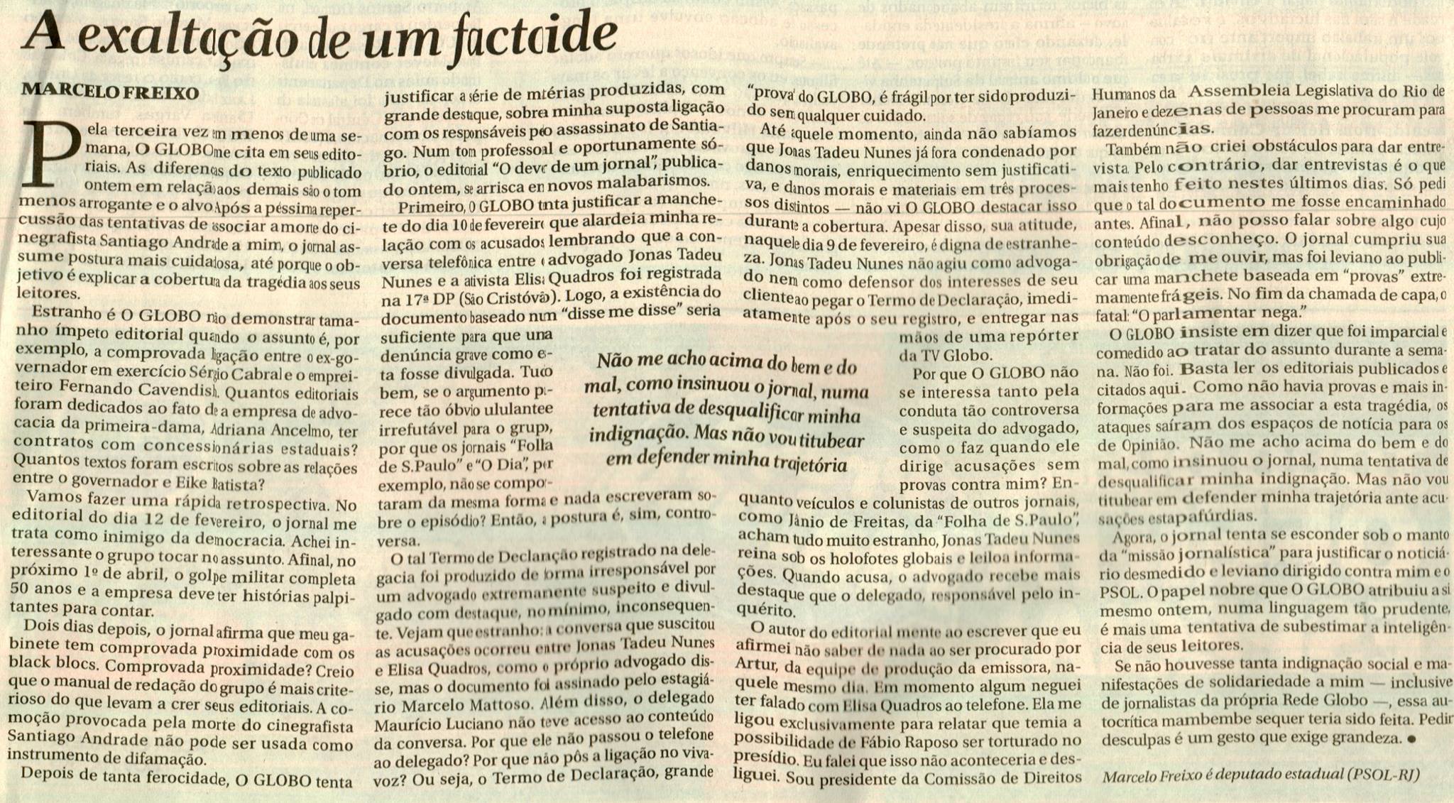 O caso dos 23 perseguidos políticos, que tem em Elisa Quadros, a Sininho, o principal alvo da mídia global, demonstra quão perigosa para a democracia pode ser a relação entre um grupo de comunicação e governos, a polícia e setores do judiciário. Sininho tem sido alvo de acusações que parecem roteiro de novela de péssima qualidade, algo que a Globo tem experiência em produzir.