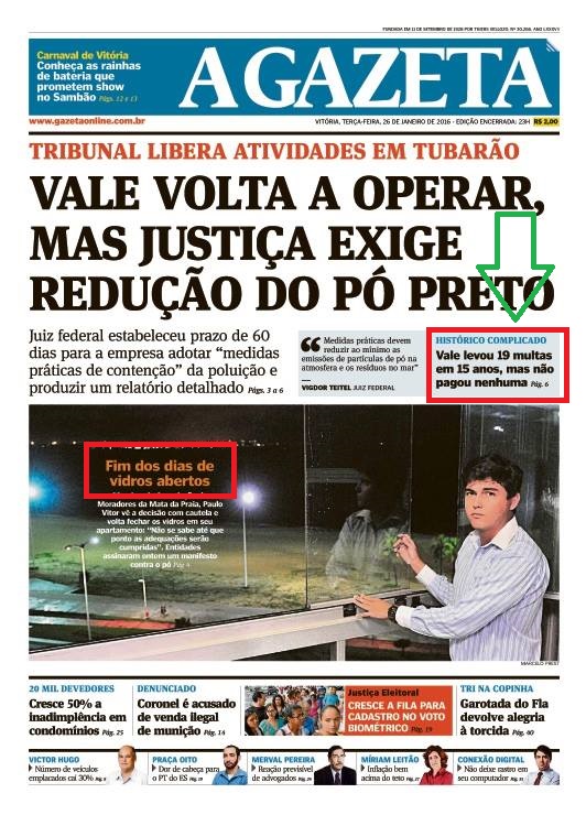 Entretanto, a capa da “A Gazeta” ainda nos traz uma reveladora imagem de um morador de uma praia na área de influência das atividades poluidoras da Vale que informa que voltará a fechar as janelas de seu apartamento por não ter nenhuma garantia de que as medidas restritivas da justiça para coibir a continuidade da poluição serão cumpridas.