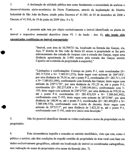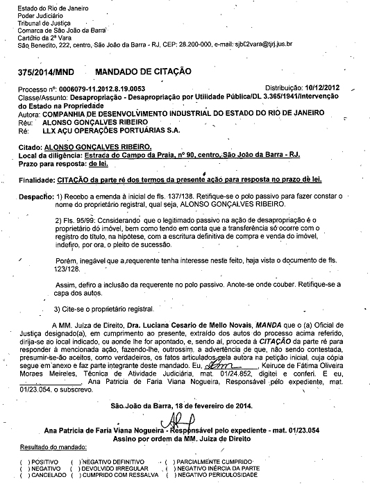 Mas tempos e algumas juntadas depois, se descobre que não só a propriedade não pertence a um réu ignorado, mas como já existe um novo ator se apresentando como legítimo proprietário, a LL(X) Açu que teria adquirido as terras em litígio do casal Alonso Gonçalves Ribeiro e Marilda Alves Ribeiro, dois tradicionais habitantes do V Distrito.