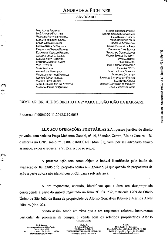 E como nova proprietária, como mostra a imagem abaixo, a LL(X) Açu requereu ser incluída como pólo passivo na ação original impetrada pela CODIN contra um suposto réu ignorado que, a estas alturas, já sabemos ser o casal Alonso e Marilda! Importante notar que o escritório responsável por defender os interesses da LL(X) Açu neste processo pertence ao irmão do então todo poderoso chefe da casa civil do (des) governador Sérgio Cabral, o Sr. Régis Fichtner, o advogado Mauro Fichtner Pereira. Aliás, é preciso lembrar que o próprio Régis Fichtner voltou a atuar neste mesmo escritório após deixar o governo do Rio de Janeiro (Aqui!).