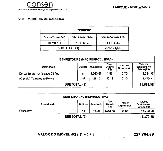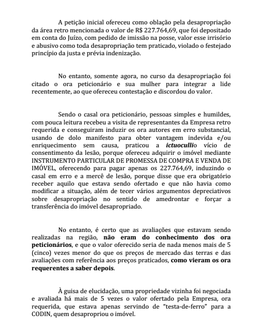 Um aspecto que merece ser ressaltado é que a razão principal deste pedido de anulação se refere ao processo recebido pelos agricultores por sua propriedade que foi de parcos R$ 227.764,59.