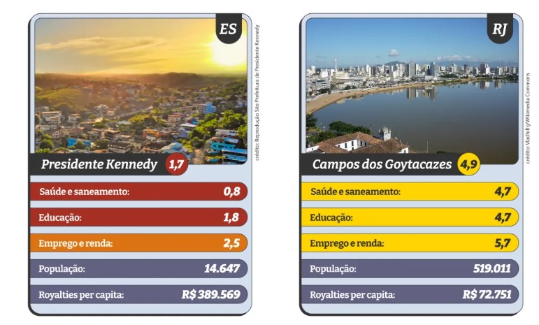A contradição não é exclusividade dos dois municípios. A Pública analisou dez indicadores socioeconômicos dos 15 municípios campeões de receitas petrolíferas per capita, como saúde, educação, pobreza e saneamento básico. Na maior parte dos casos, os municípios petrorrentistas estão entre os piores de seus estados. Kennedy está entre as piores cidades do Espírito Santo nos dez indicadores, enquanto Campos tem desempenho apenas intermediário na maior parte dos índices.